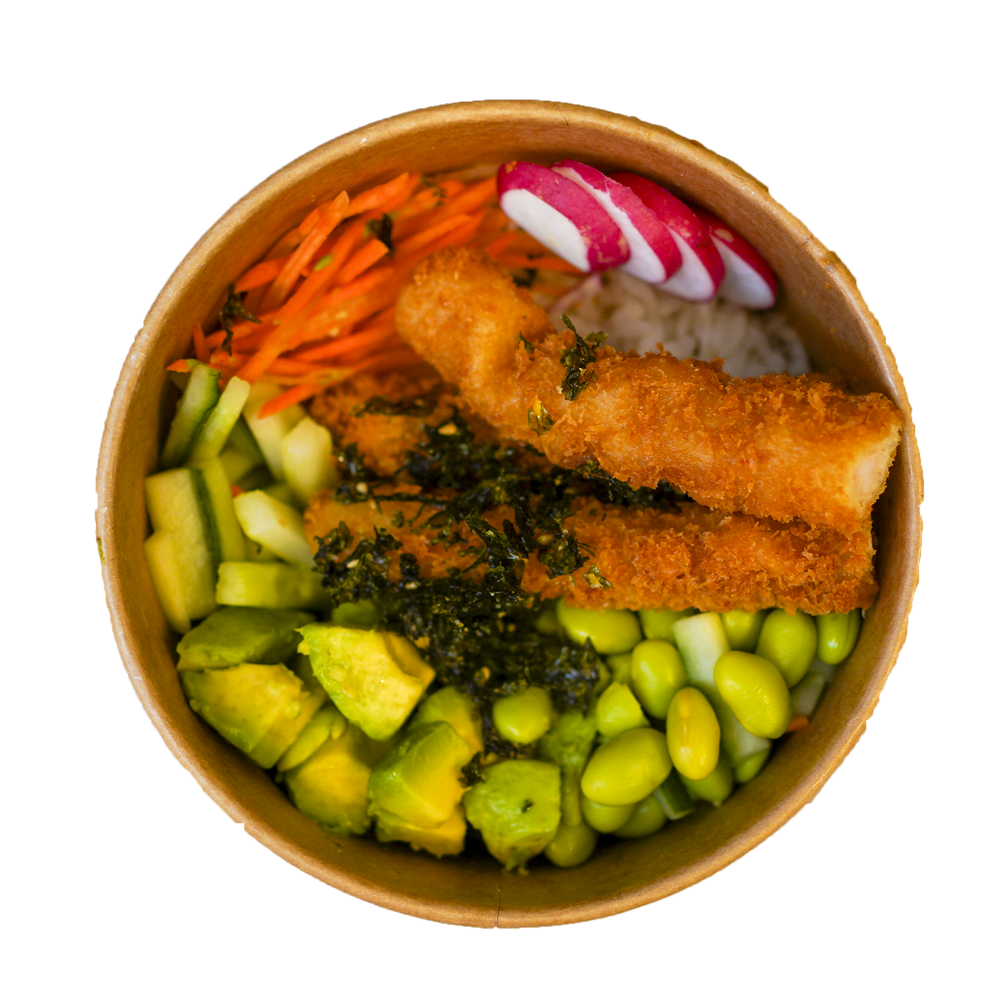 Crispy Ebi, edamame, tyndt sliced radiser, agurk og gulerødder. Toppes med ristede seaweed, forårsløg og sesamfrø. På en bund af lune sushiris.