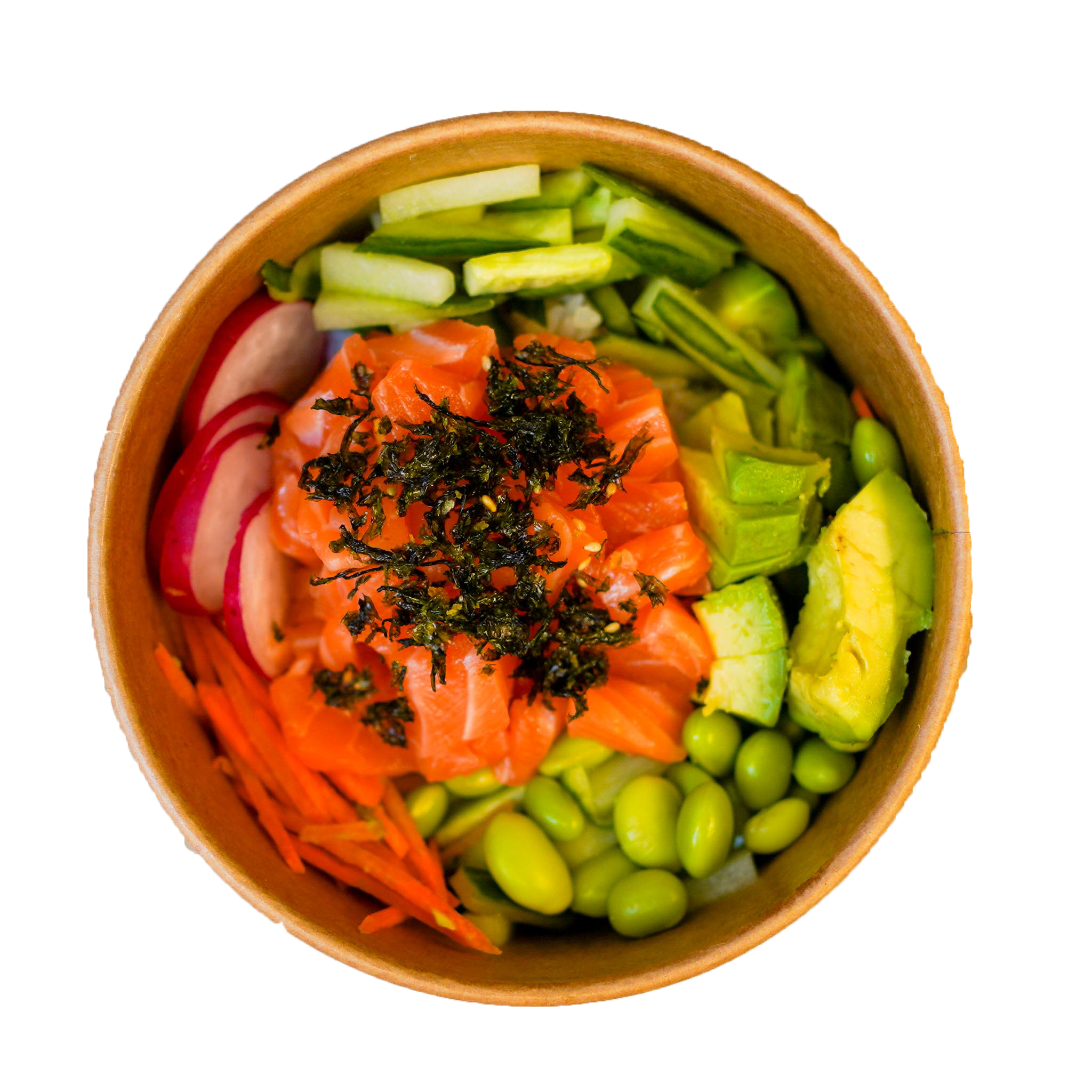 Laks, edamame, tyndt sliced radiser, agurk, tørrede seaweed og gulerødder. På en bund af lune sushiris.